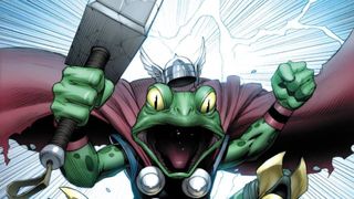 The original Frog Thor was Thor himself, transformed temporarily into a frog by his scheming brother Loki. Only later, a second Frog Thor, known adorably as Throg was born when an actual amphibian found a splinter of right Mjolnir, turning him into the Frog of Nose drops.